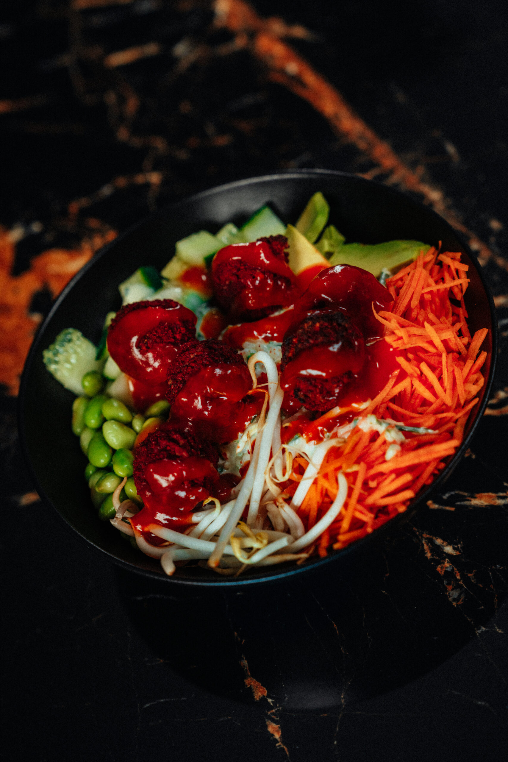 Falafel + Soße – Sushireis oder Vollkornreis – Karottenstifte – Edamame – Gurke – Avocado – Radieschen – Sprossen (A1)(F)