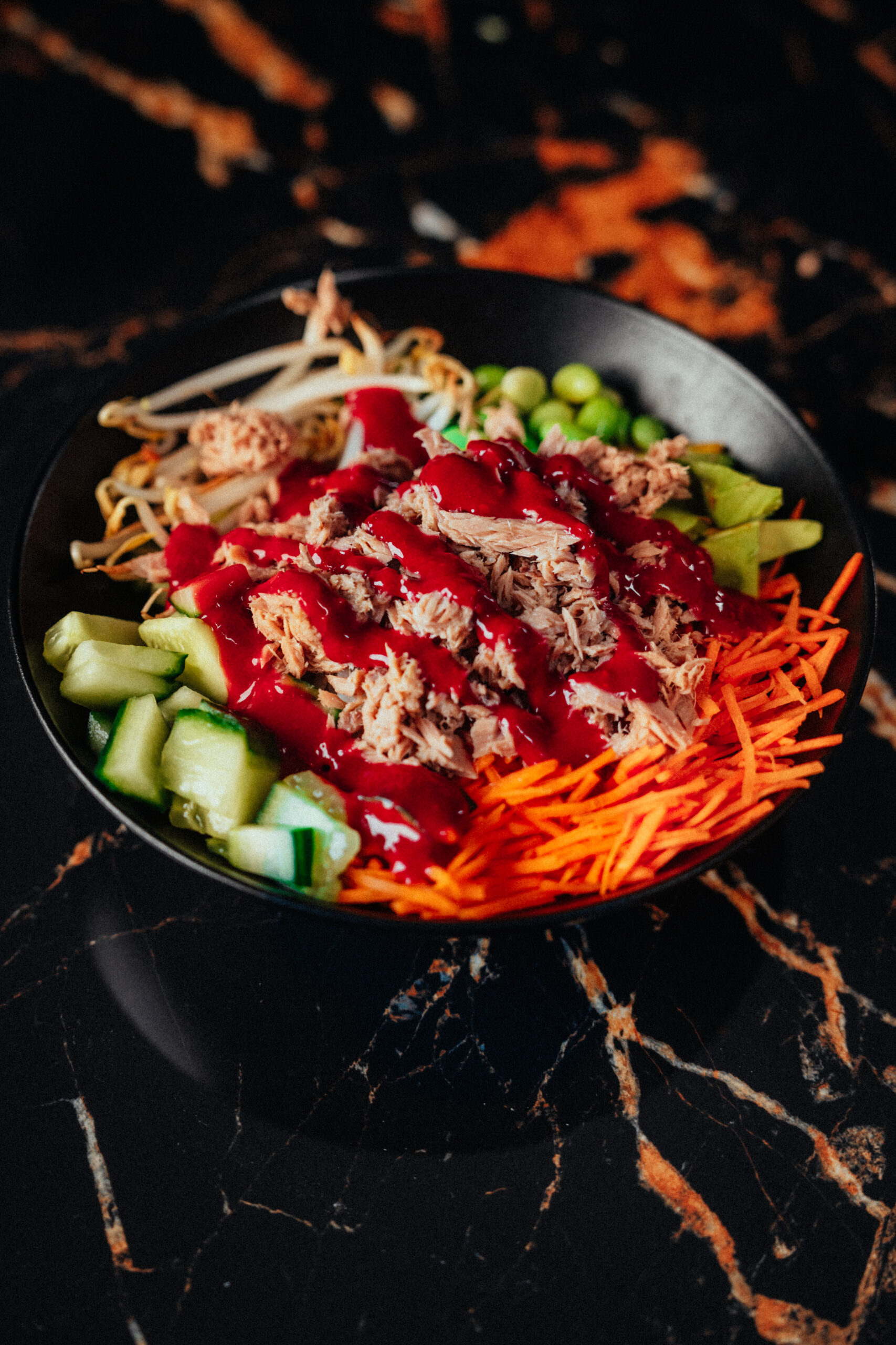 Thunfisch + Soße – Sushireis oder Vollkornreis – Karottenstifte – Edamame – Gurke – Avocado – Radieschen – Sprossen (D)